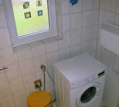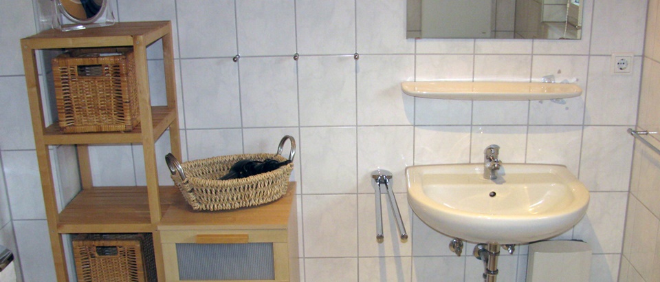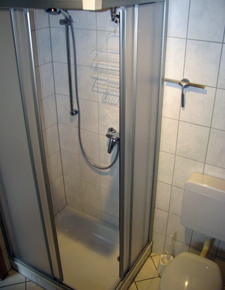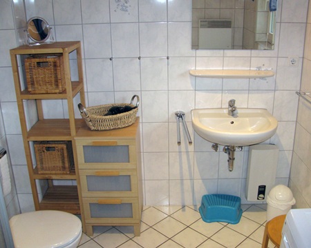 Bad mit Dusche, WC und Waschbecken im Erdgeschoß. Eine zusätzliche Toilette befindet sich im Obergeschoß.