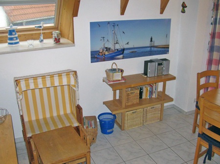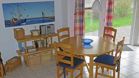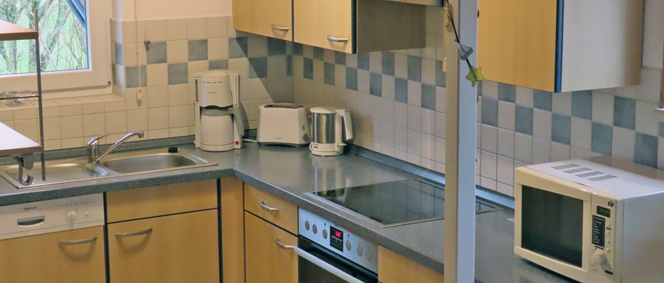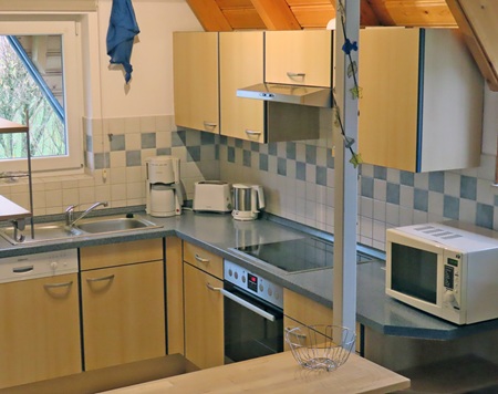 Komplett eingerichtete Einbauküche mit Mikrowelle und Spülmaschine und genügend Platz am ausziehbaren Esstisch auch für 6 Personen.